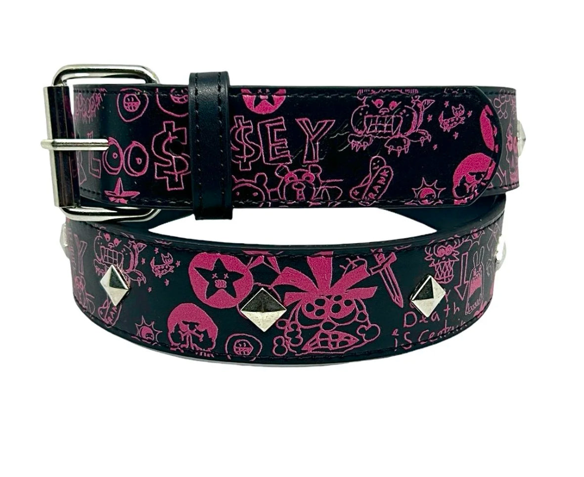 Black Faux leather with silver studs and pink printed art by Frank himself.